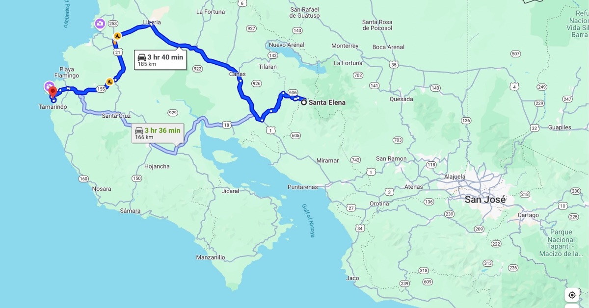 So, if you are driving here, the main route into Tamarindo & Playa Grande from Monteverde will take around 4 hours. You take Ruta 606 from Sana Elena, linking into Route (Highway) 1.