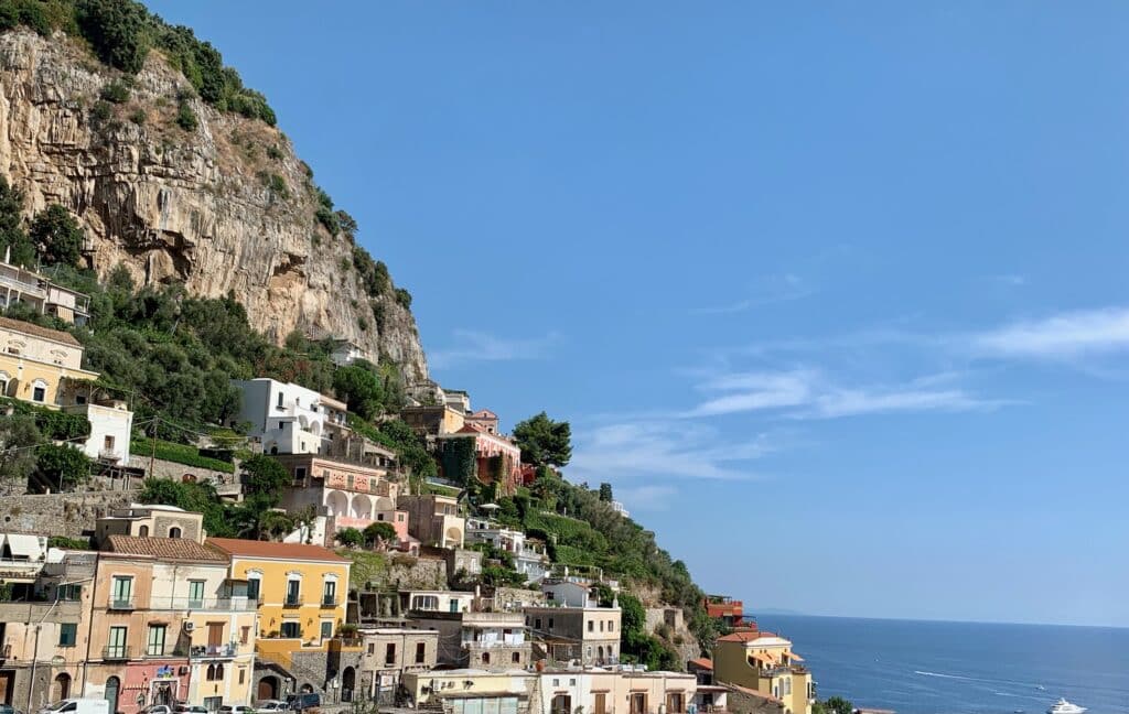 A village that clings to the cliffs of Amalfi Coast Italy with levels of homes and a steep winding street down to the water.